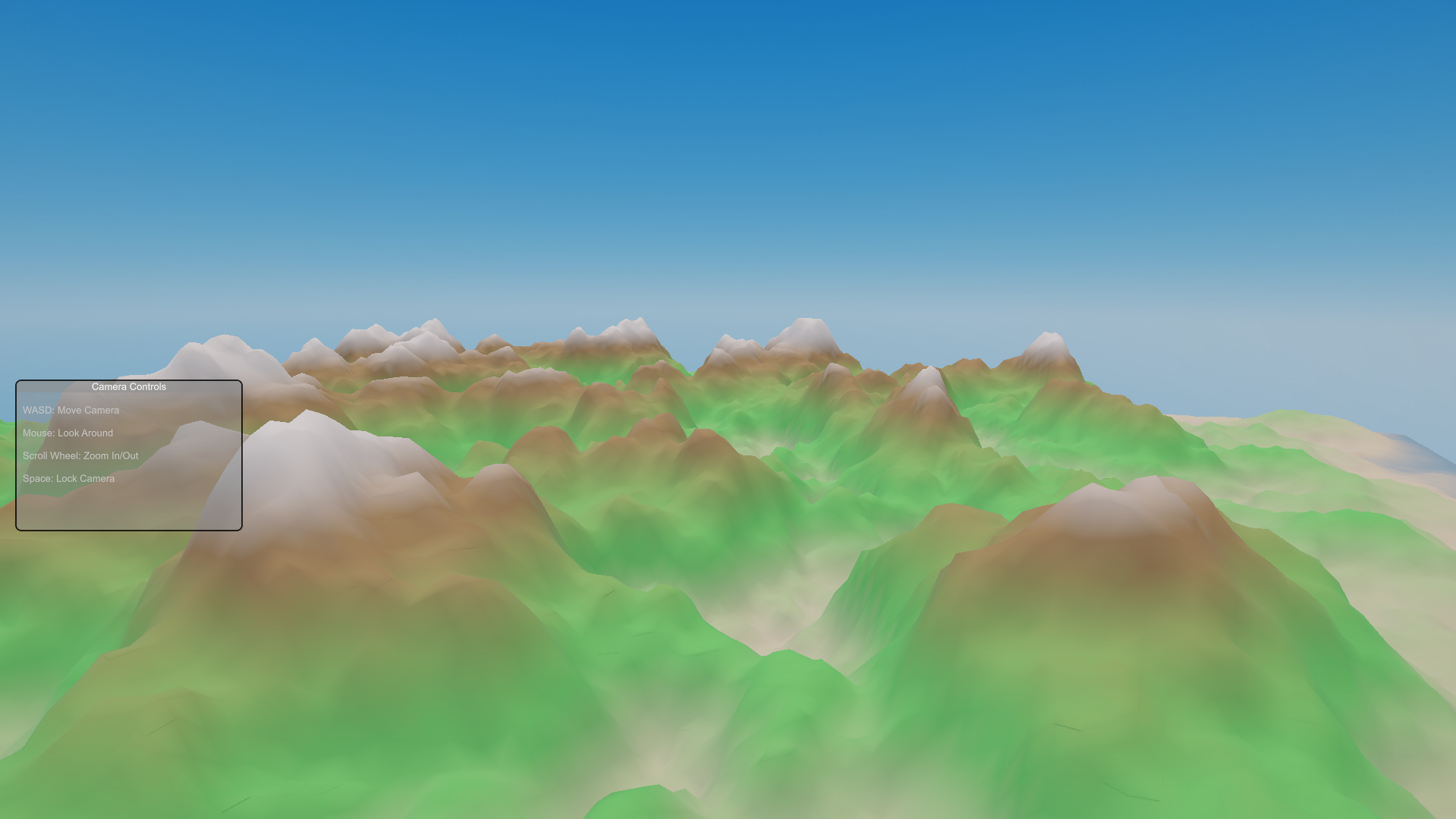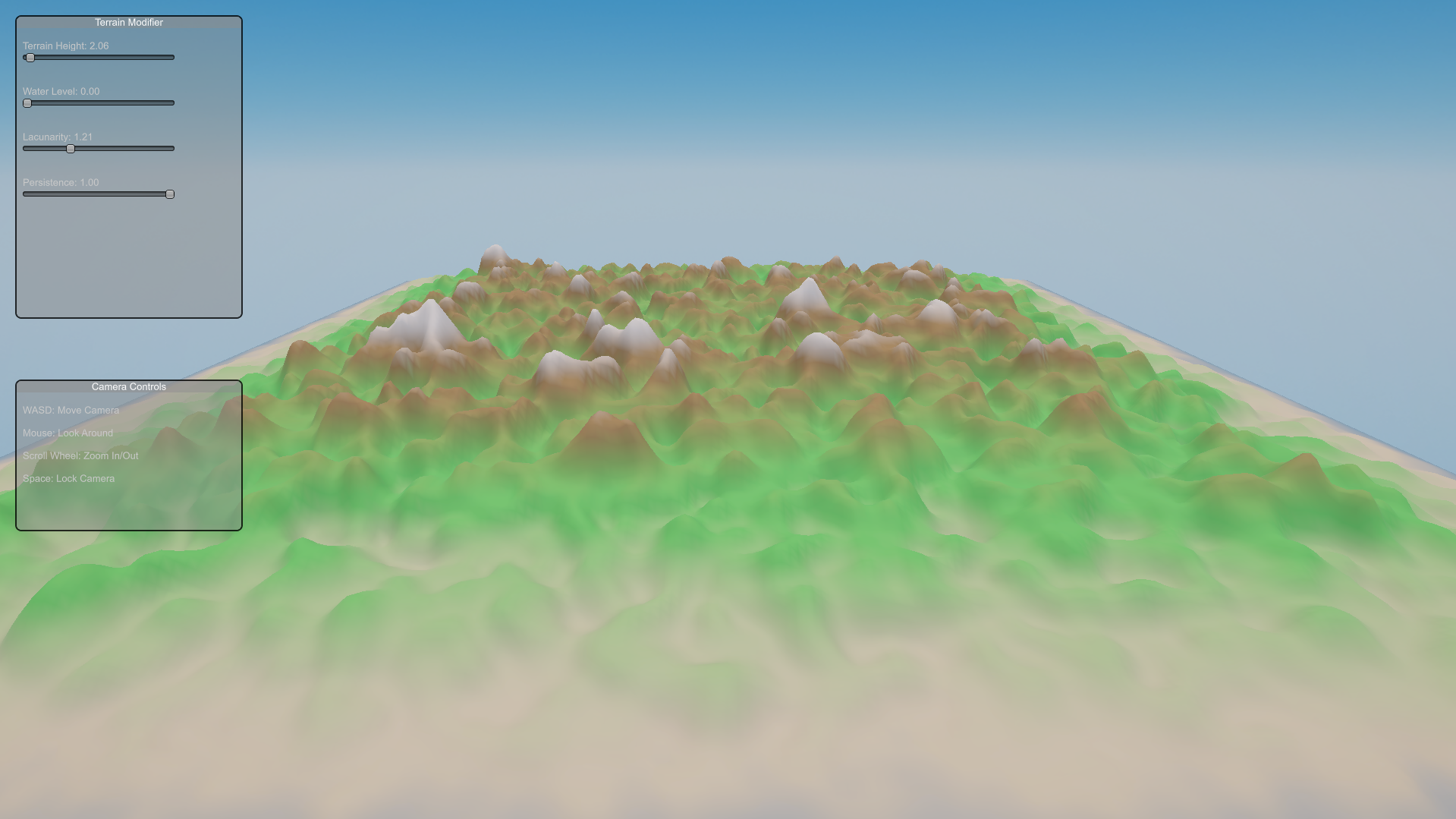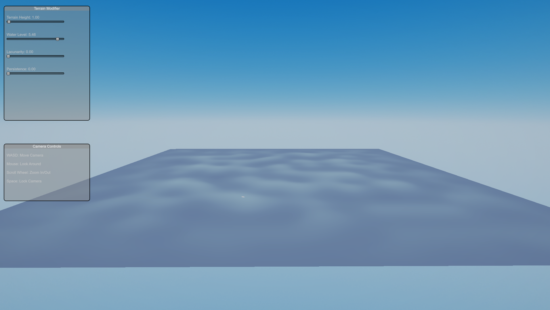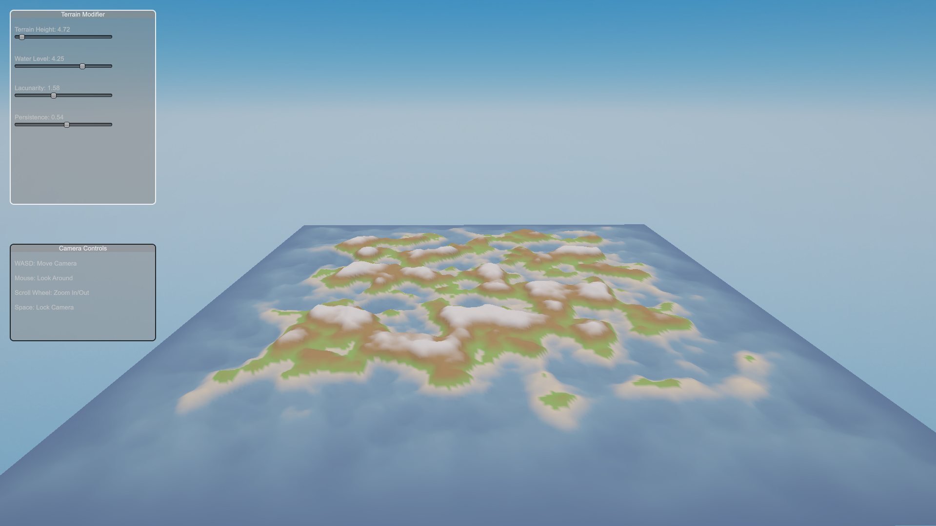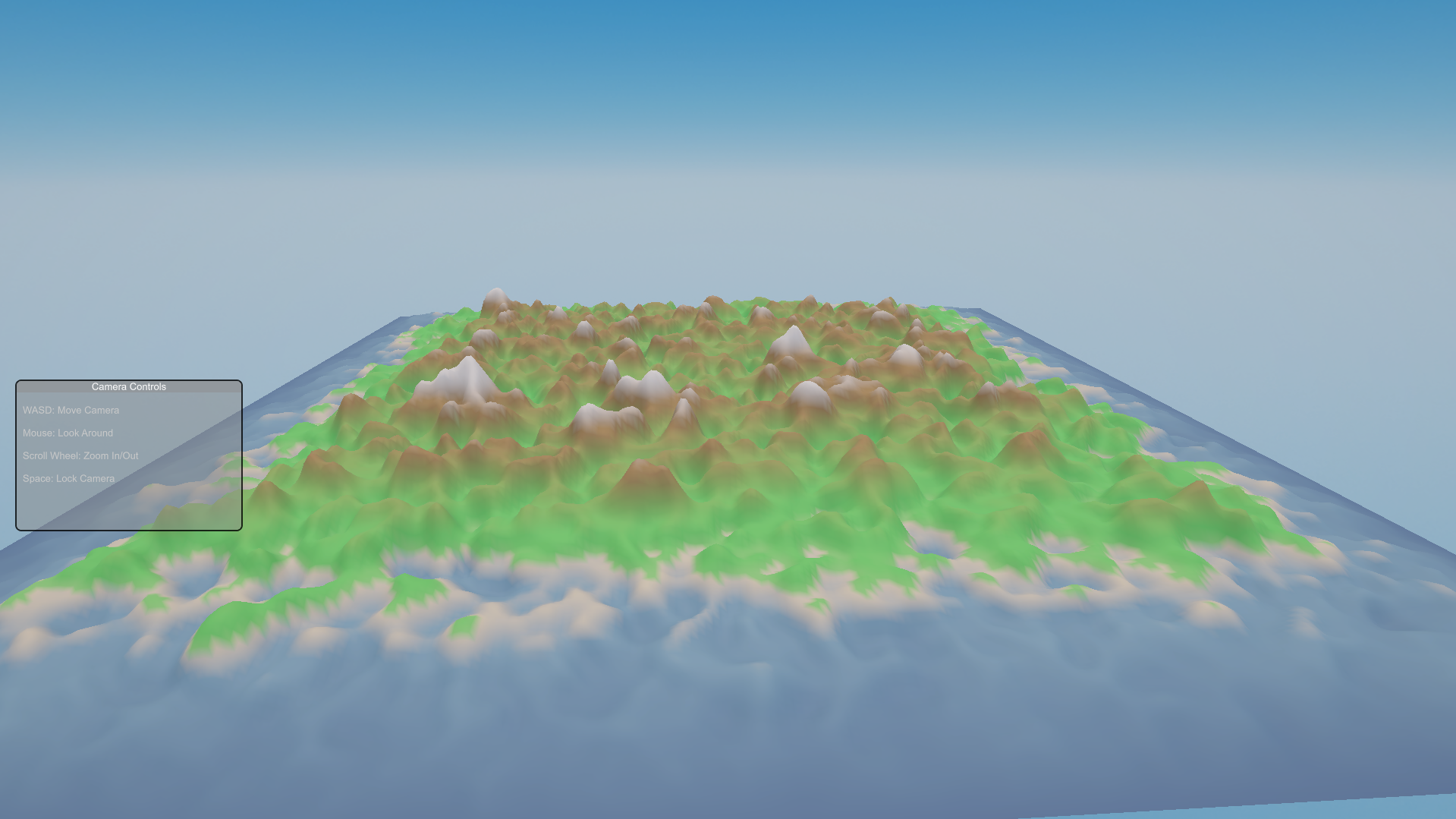 The final project for Procedural Generation was to generate terrain. The actual requirements for the project were quite simple, just defining vertices based on grid dimensions, defining triangles based on indices and creating quads based on the triangles. The simplicity of requirements allowed me to experiment. I added tunable settings a user can tinker with, as well as adjusting water levels. For coloring the mesh, initially I used a gradient which was evaluated based on height, but I didn't like the result of that, so I used an inverse lerp to create a blend factor for each region so I could lerp between regions, allowing more smooth coloring.